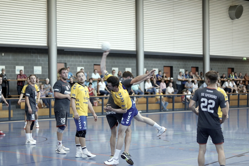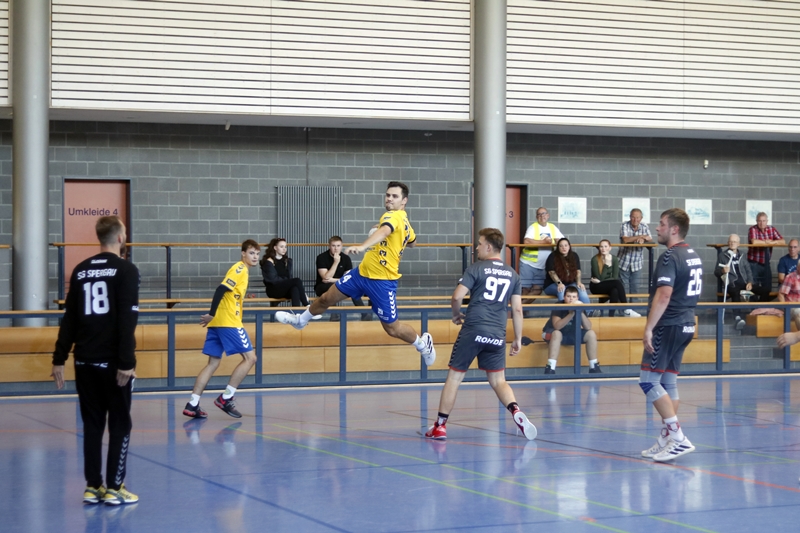 Das Spiel wurde pünktlich 16:00 von den beiden Unparteiischen mit Anwurf der Gäste angepfiffen. Es begann vollends zu Gunsten der Fichte. Die Abwehr stimmte und ein stark aufgelegter F. Frind konnte die durchkommenden Bälle teilweise sehenswert parieren. Durch die so entstandenen Ballgewinne wurde das Tempospiel aufgezogen und die Uhr zeigte nach knapp 8 Minuten 5:1 für die Hausherren an. Die Gäste aus Spergau sahen sich gezwungen eine frühe Auszeit zu nehmen. In dieser besprach man seinerseits, weiter so aggressiv in der Abwehr zu sein um Ballverluste zu erzwingen. Doch die Auszeit brachte auch Spergau endlich ins Spiel. Sie fanden nun häufiger Lösungen und im Erdeborner Angriffsspiel schlichen sich bekannte Schwächen im Abschluss ein. Über die Spielstände 6:5, 9:7 und 11:8 ging es schließlich mit einer Drei-Tore-Führung beim 12:9 in die Pause.