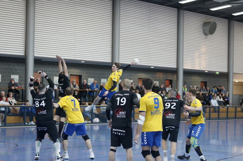 Nach dem letzten überzeugenden Heimsieg vergangene Woche gegen Halberstadt empfingen an diesem Wochenende die Fichte-Männer mit dem SV Stahl Thale den nächsten Konkurrenten im engen unteren Tabellendrittel. Die Schützlinge von Trainer Frank Hammerschmidt wollten den Schwung mitnehmen und hielten das Tempo im Spiel von Beginn an sehr hoch. Trotz der Gästeführung im ersten Angriff (es sollte die Einzige im Spiel bleiben) gingen die Hausherren voran und drehten auf. Vor allem Philipp Schatz aus dem Rückraum ließ dem gegnerischen Torhüter nicht den Hauch einer Chance. Die Gäste agierten mit einer offensiven Abwehr, die jedoch von den Erdebornern durch viel Bewegung und schnelle Beine ausgehebelt werden konnte. Bereits nach neun gespielten Minuten sah sich der Thale-Trainer zu einer Auszeit gezwungen, doch diese verpuffte, denn Erdeborn marschierte weiter und hatte mit Florian Frind im Tor einen sicheren Rückhalt an diesem Tag. Die Gäste stellten nun auf eine 6-0 Deckung um und die Gangart wurde härter. Erdeborn blieb konzentriert und effektiv im Abschluss. Die Genauigkeit im Spiel der Fichte war der Schlüssel zum Erfolg, sowie die geschlossene kämpferische Leistung. In der 20. Spielminute musste der Gästetrainer bereits die zweite Auszeit nehmen, um den Lauf der Erdeborner zu stoppen. Bis zur Halbzeitsirene konnten die Hausherren die Führung auf 14:6 ausbauen und legte damit den Grundstein zum Erfolg.