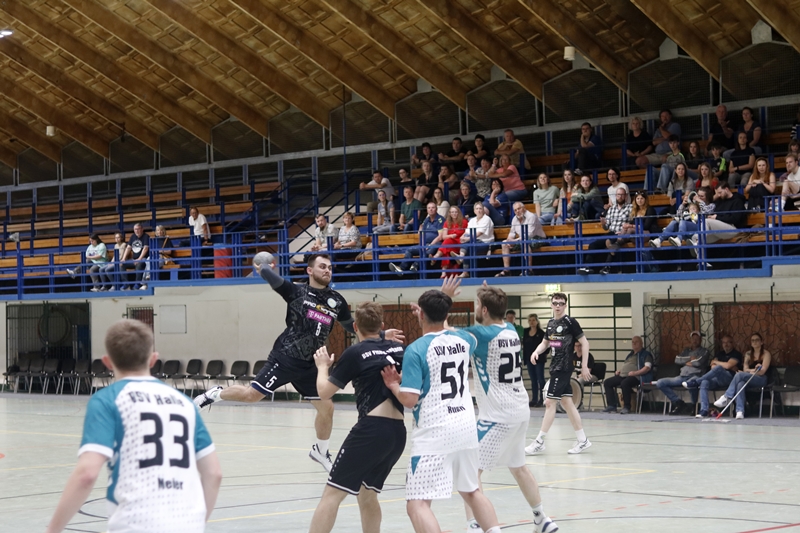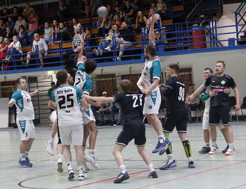 Nach dem Seitenwechsel übernahm Erdeborn zunehmend das Kommando. Ein stark parierenden Sven Schmeißel und ein Philipp Schatz der das Spiel klug führte und selbst wichtige Treffer erzielte – 11 Tore insgesamt, waren wichtige Schlüsselfiguren in diesem Spiel. Auch Jannik Schatz zeigte sich mit sechs Treffern enorm effektiv. Hinzu kamen Tore von Paul Nikiforow (4) und Michel Hammerschmidt (2). Durch konsequente Abwehrarbeit und variable Angriffe konnte sich Erdeborn ab der 40. Minute Stück für Stück endlich absetzen. In der 44. Minute stand es 22:17 – die höchste Führung des Spiels. Doch wie so oft in dieser Saison schlichen sich kleine Fehler und Unkonzentriertheiten ein. Fehlpässe, überhastete Abschlüsse und eine kurzzeitige Unordnung im Rückzugsverhalten brachten Halle wieder ins Spiel.