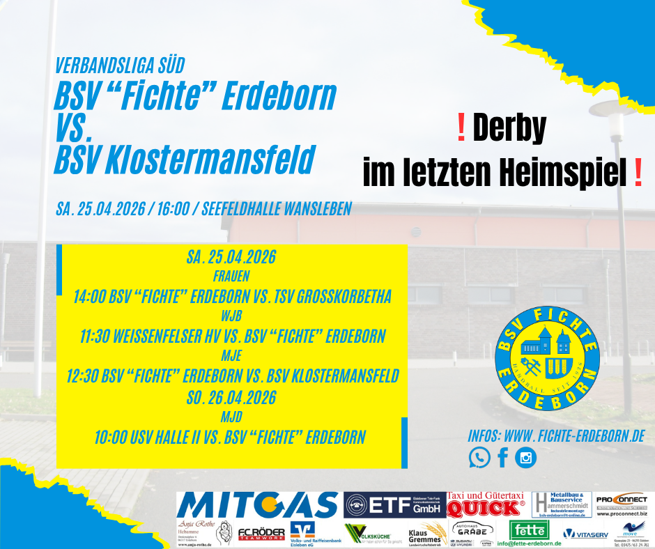 Die "Fichte" Männer kämpften aufopferungsvoll und verlangten den favorisierten Wittenbergern alles ab. Am Ende musste man sich dennoch mit 31:35 geschlagen geben. Nun steht bereits das letzte Heimspiel in dieser Saison an, und das wird noch einmal ein richtiger Kracher. Am Samstag steigt das Derby gegen den BSV Klostermansfeld, da ist Stimmung garantiert. Die Gäste stehen derzeit auf dem vorletzten Tabellenplatz und haben das schlechteste Torverhältnis der Liga. Vor allem defensiv sind es zu viele Gegentore, die man in den letzten Spielen bekommt. Die Männer von Trainer Frank Hammerschmidt wollen im letzten Heimspiel der Saison noch einmal alles heraushauen, und ein versöhnliches Saisonende feiern.Auch die Frauenmannschaft darf nach langer Zeit wieder in der heimischen Seefeldhalle antreten. Zu Gast wird der TSV Großkorbetha sein, welcher eine durchschnittliche Saison spielt. Im Hinspiel konnte sich das Team von Trainer Alexander Bunk knapp durchsetzen. Daher wird auch dieses Mal der Heimsieg das Ziel sein.Unsere "Fichte" Talente sind ebenso an diesem Wochenende gefordert. Die WJB muss zum schweren Auswärtsspiel in Weißenfels antreten, ebenso muss die MJD auswärts bei der zweiten Mannschaft des USV Halle ran. Die MJE bestreitet am Samstag bereits um die Mittagszeit das kleine Derby gegen den BSV Klostermansfeld.